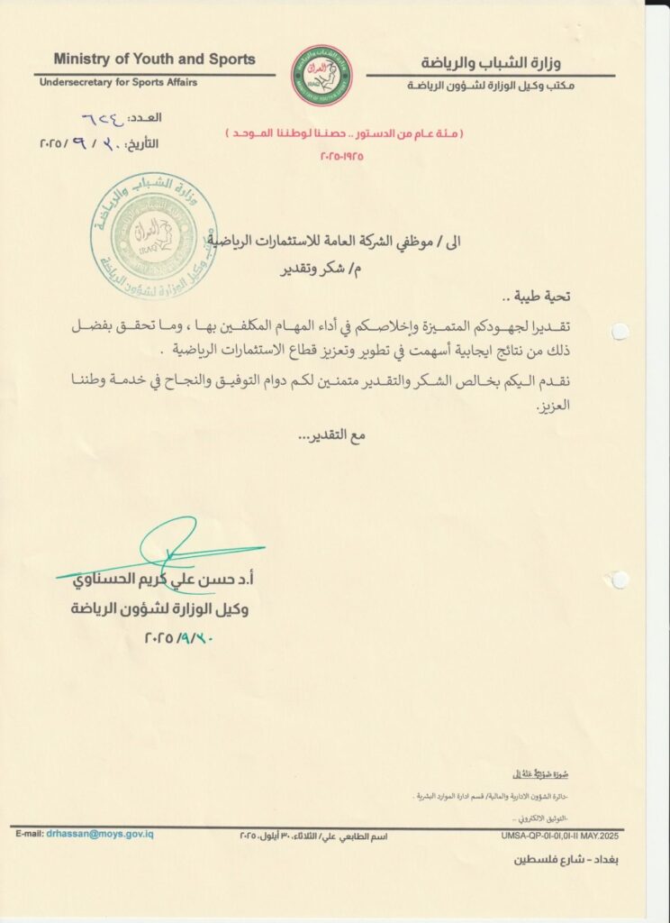 وجه السيد وكيل الوزارة لشؤون الرياضة أ.د حسين علي كريم الحسناوي بمنح موظفي الشركة كتاب شكر وتقدير لانجازهم اعمال وظيفتهم بكل تفان واخلاص، اذ جاء في نص كتاب الشكر والتقدير.. تقديرا للجهود المبذولة لانجازهم اعمال وظيفتهم واخلاصهم في اداء المهام المكلفين بها وما تحقق بفضل ذلك من نتائج ايجابية اسهمت في تطوير وتعزيز قطاع الاستثمارات الرياضية، نتقدم بالشكر الجزيل وتقديرنا العالي متمنيا لهم دوام التوفيق والنجاح في خدمة وطننا العزيز.